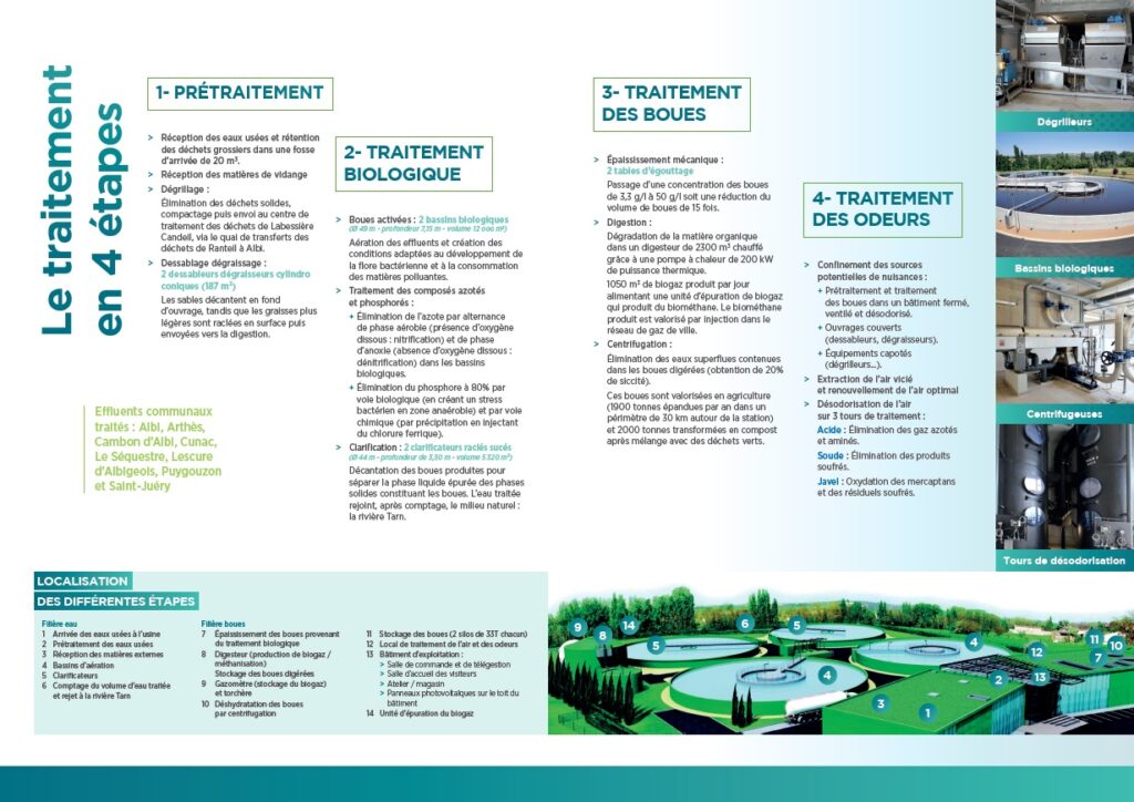 Lorsque vous vous lavez les mains ou que vous tirez votre chasse d’eau, les eaux dites « usées » quittent votre évier ou vos toilettes, s’écoulent dans les canalisations et aboutissent dans une installation de traitement. Il y a 17 stations d’épuration sur le territoire et toutes sont gérées en régie par le Grand Albigeois. La plus importante est la station d’épuration (STEP) de La Madeleine, qui traite les eaux usées des habitants de huit communes (Albi, Arthès, Cambon d’Albi, Cunac, Le Séquestre, Lescure d’Albigeois, Puygouzon et Saint-Juéry). Soit 65 000 habitants ! Dans cet équipement ouvert en 2010, l’eau subit plusieurs étapes de traitement : elle est d’abord dépolluée, débarrassée des déchets physiques, puis épurée biologiquement, clarifiée et enfin rejetée dans la rivière.