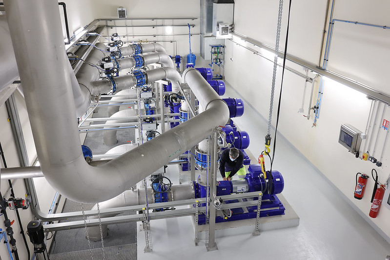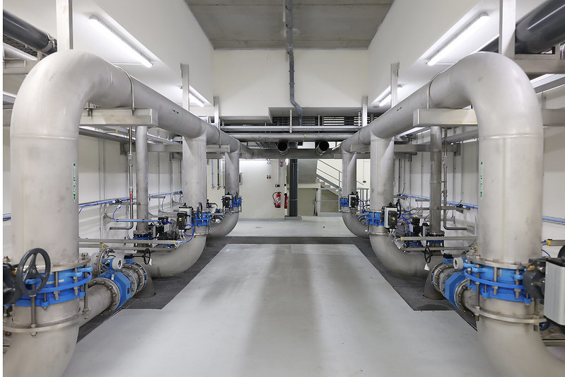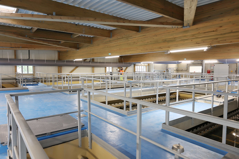 Une fois arrivée à la station, l’eau passe par une succession de bassins où elle est décantée, puis filtrée avec du sable. Une fois claire et pure, l’eau est remise à l’équilibre – à un pH neutre – puis désinfectée avec du chlore ou du bioxyde de chlore. Le pilotage de l’eau est quasi-automatisé, mais les techniciens veillent toujours au grain… Des sondes sont installées sur l’ensemble du parcours de l’eau au sein de la station, pour permettre aux agents d’ajuster, au besoin, diverses données (pression, température, pH, chlore…). De la station, l’eau potable est envoyée vers les réservoirs dits « de tête » qui alimentent ensuite les communes.
